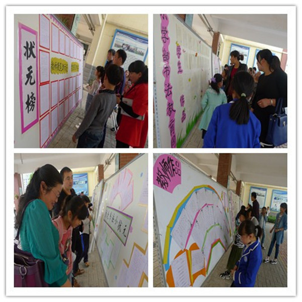 在展示现场,中了状元榜的孩子们开心而自豪地告诉爸爸妈妈,“这是我写的!”把喜悦与家人一起分享;有的寻寻觅觅则发现自己没有上榜,但是找到了身边的榜样,也倍受激励……老师们的书法也晒了出来,或飘逸、或硬朗、或俊美……给学生树立良好的榜样。最引人注目的要属杨校长的“我是书法小状元”、潘主管的“状元榜”的题字了,孩子们和家长参观之余,赞不绝口。孩子们自豪地说:“看!这是我们校长的字!写得最棒啦!”“这么好的示范字,多好的资源,孩子一定要好好学!”家长们边欣赏边鼓励孩子……