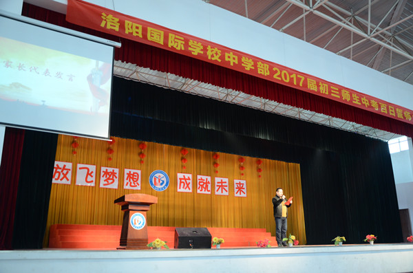 阳春三月,春寒料峭。展望六月,热血沸腾。为了充分调动初三年级师生冲刺中考的积极性,激发学生的拼搏精神,营造浓厚的备考氛围。2017年3月17日下午,洛阳国际学校中学部初三年级在体育馆隆重举行了“2016——2017学年第二学期第一次月考表彰暨中考百日誓师大会”。